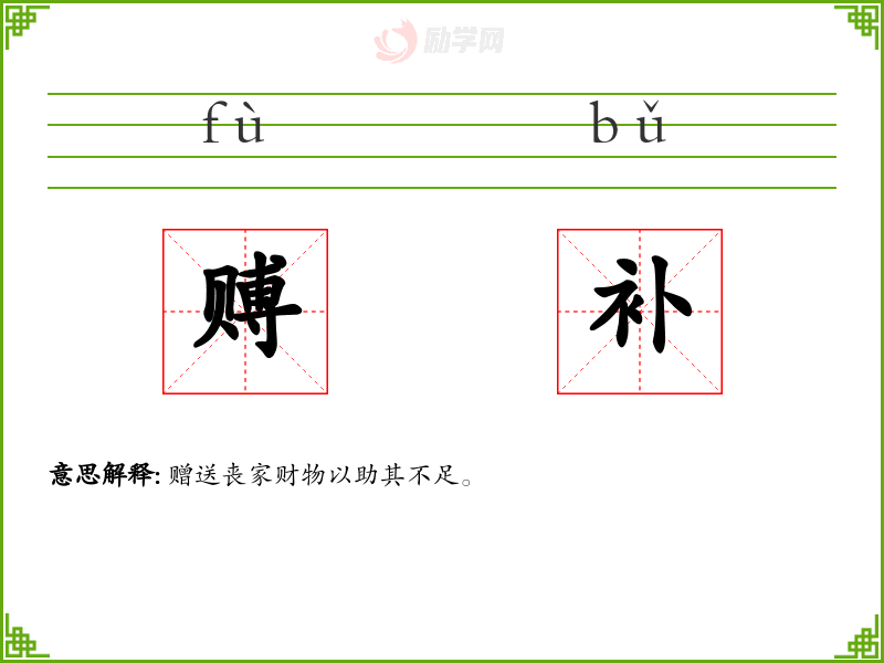 《玉篇》-赙,以财助丧也。 《公羊传·隐公元年》-车马曰賵,货财曰赙。 《仪礼·既夕礼》-知死者赠,知生者赙。 《礼记·曲礼上》-吊丧弗能赙。 《后汉书·杜诗传》-赙绢千匹。