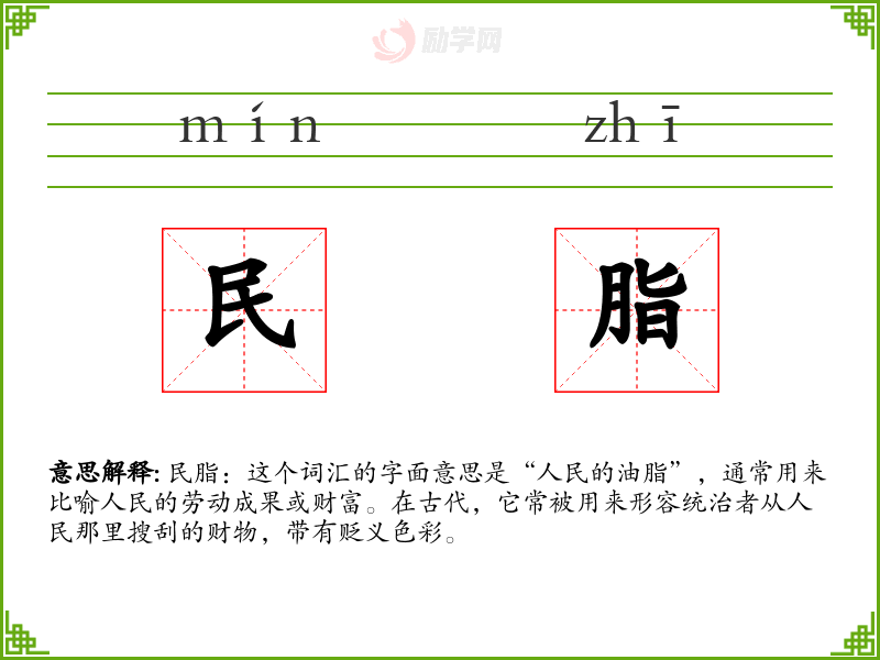民脂的意思是:比喻人民的劳动果实。