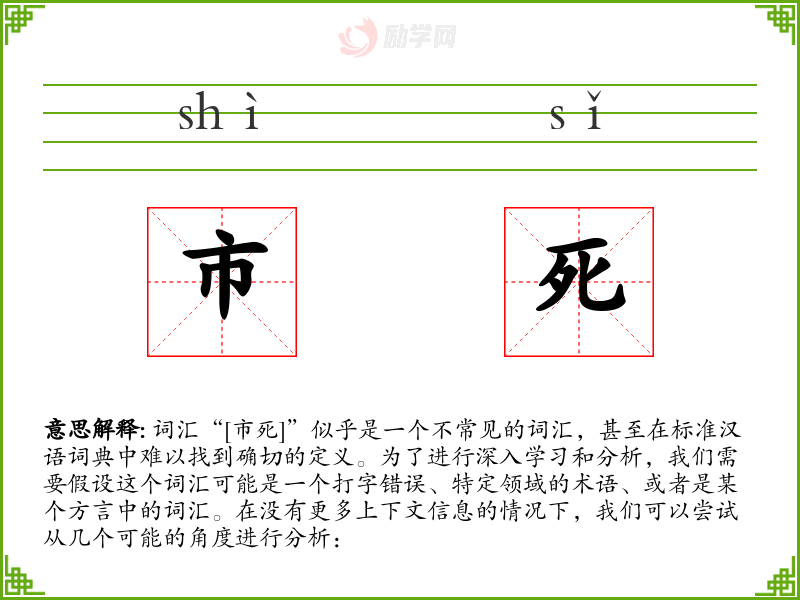词汇“[市死]”似乎是一个不常见的词汇,甚至在标准汉语词典中难以找到确切的定义。为了进行深入学习和分析,我们需要假设这个词汇可能是一个打字错误、特定领域的术语、或者是某个方言中的词汇。在没有更多上下文信息的情况下,我们可以尝试从几个可能的角度进行分析: