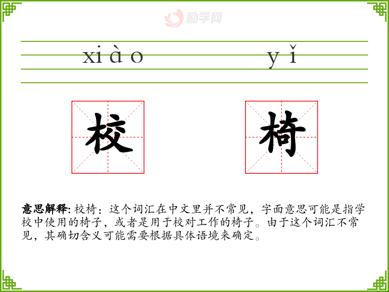 校椅:这个词汇在中文里并不常见,字面意思可能是指学校中使用的椅子,或者是用于校对工作的椅子。由于这个词汇不常见,其确切含义可能需要根据具体语境来确定。