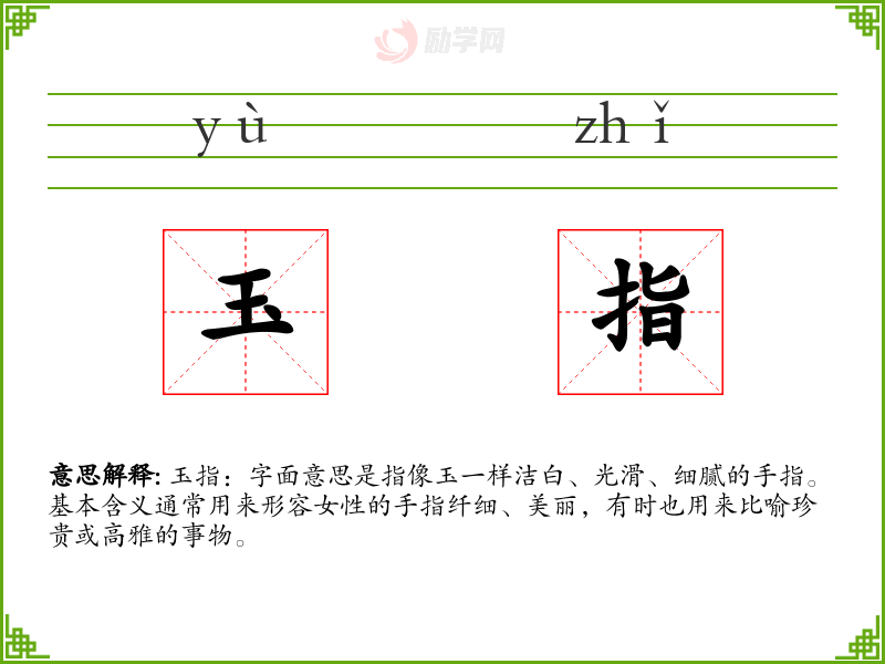 玉指:字面意思是指像玉一样洁白、光滑、细腻的手指。基本含义通常用来形容女性的手指纤细、美丽,有时也用来比喻珍贵或高雅的事物。