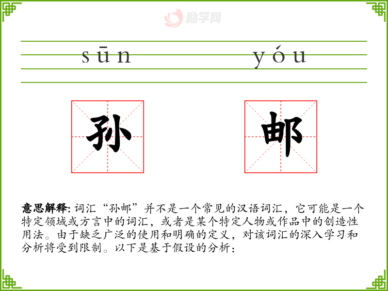 由于缺乏广泛的使用,我们无法讨论“孙邮”在不同语境下的使用。它可能出现在某个特定的文学作品、口语交流或专业领域中,但这些都需要具体的上下文来确定。