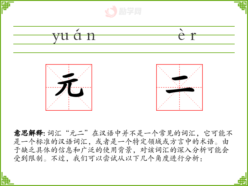 由于“元二”不是一个常见的词汇,我们无法提供一个确切的基本定义。它可能是由“元”和“二”两个字组合而成的,其中“元”可以指代“第一”、“首要”或“货币单位”等含义,而“二”则表示“第二”或“数字二”。