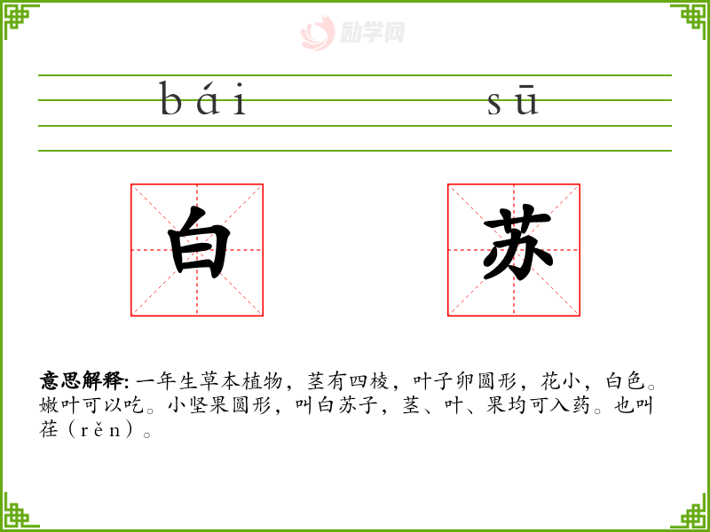 白苏的意思是:一年生草本植物,茎有四棱,叶子卵圆形,花小,白色。嫩叶可以吃。小坚果圆形,叫白苏子,茎、叶、果均可入药。也叫荏(rěn)。