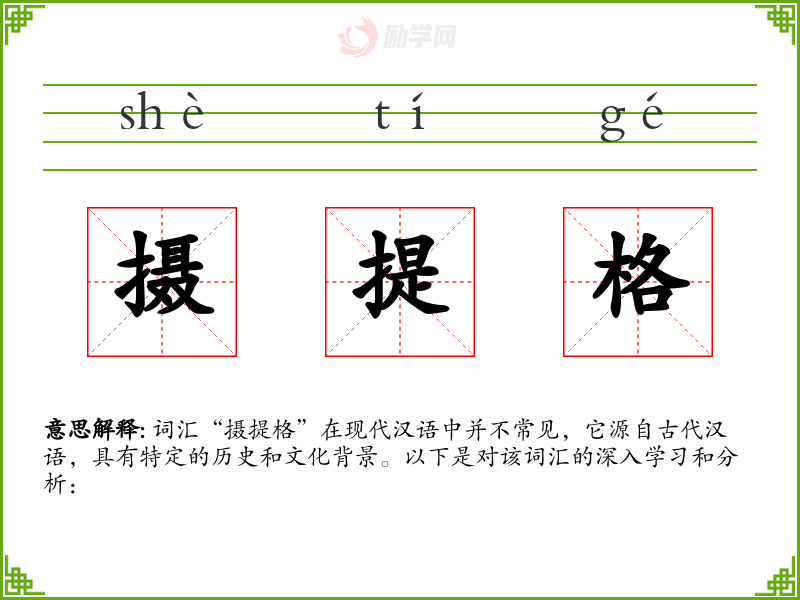 词汇“摄提格”在现代汉语中并不常见,它源自古代汉语,具有特定的历史和文化背景。以下是对该词汇的深入学*和分析:
