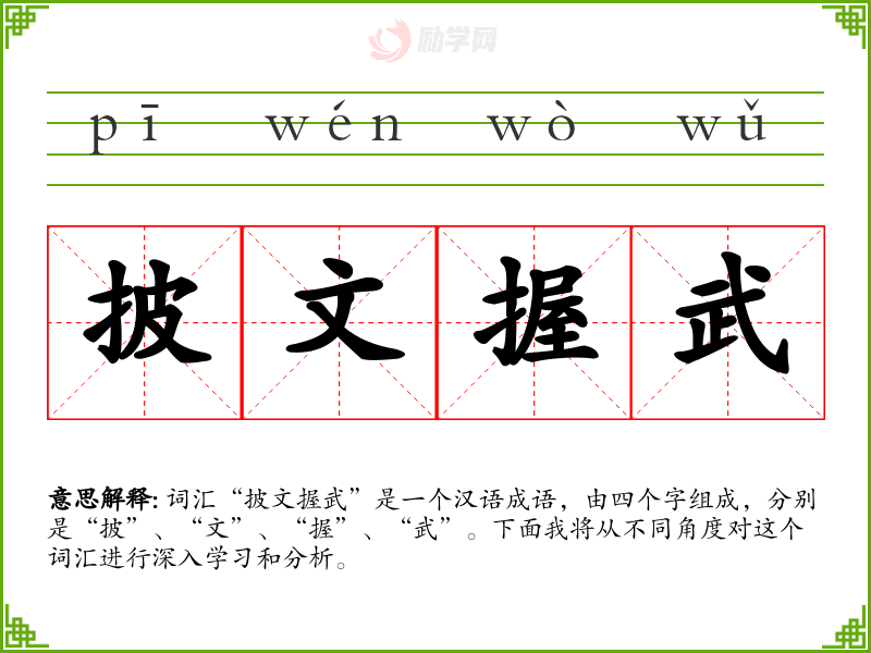 词汇“披文握武”是一个汉语成语,由四个字组成,分别是“披”、“文”、“握”、“武”。下面我将从不同角度对这个词汇进行深入学*和分析。