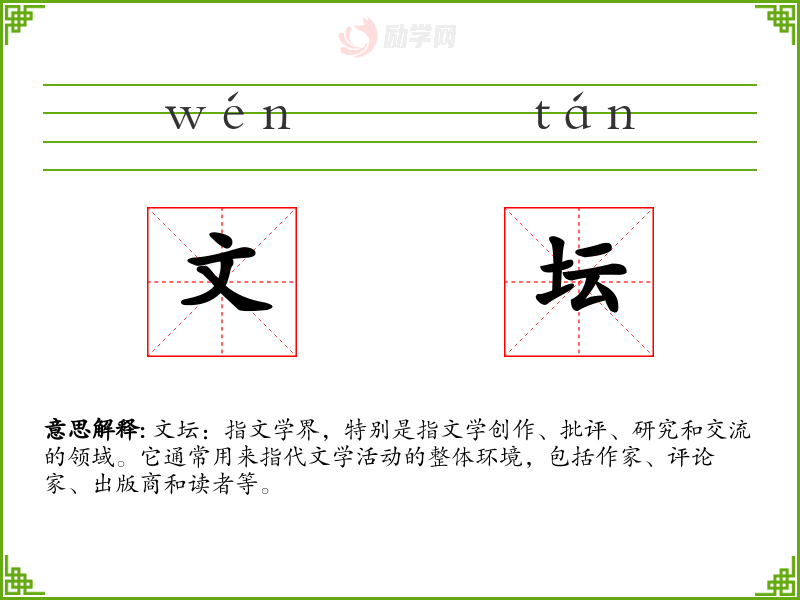 - 反义词:商界、政界(这些词汇指代不同的社会领域,与“文坛”没有直接的反义关系)