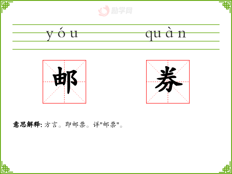 邮[ yóu ] 1. (会意。从邑垂。垂,边郵;邑,城邑。“邮”,从邑,由声。本义:古地名。)。 2. 同本义。 【引证】 《说文》。按,邮亭,邮乡,在今陕西西安府高陵县。-邮,左冯翊高陵,从邑,由声。 [更多解释]