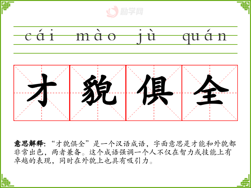 “才貌俱全”是一个汉语成语,字面意思是才能和外貌都非常出色,两者兼备。这个成语强调一个人不仅在智力或技能上有卓越的表现,同时在外貌上也具有吸引力。