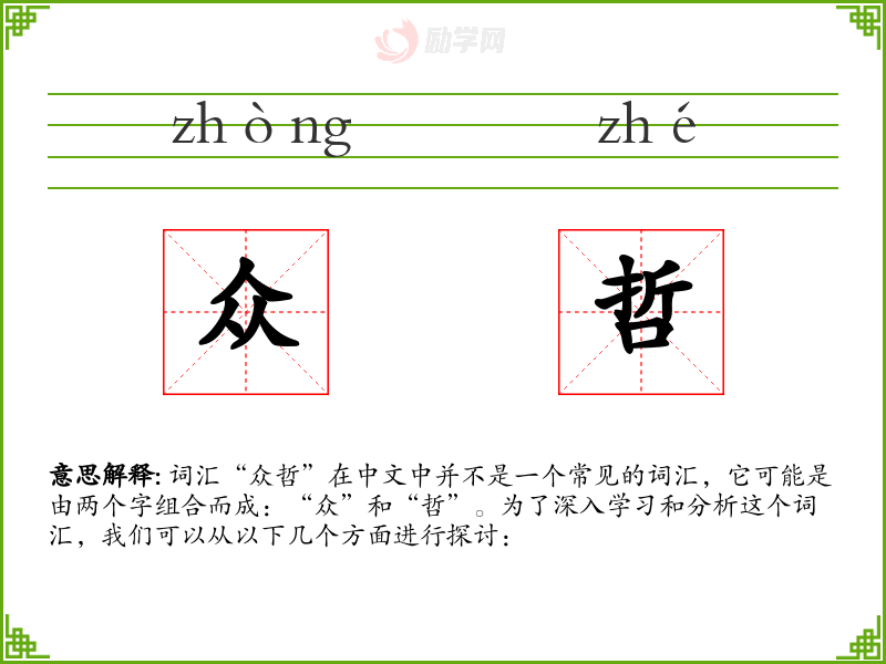 词汇“众哲”在中文中并不是一个常见的词汇,它可能是由两个字组合而成:“众”和“哲”。为了深入学习和分析这个词汇,我们可以从以下几个方面进行探讨: