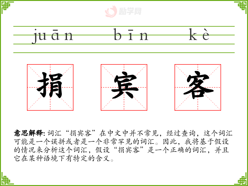 词汇“捐宾客”在中文中并不常见,经过查询,这个词汇可能是一个误拼或者是一个非常罕见的词汇。因此,我将基于假设的情况来分析这个词汇,假设“捐宾客”是一个正确的词汇,并且它在某种语境下有特定的含义。