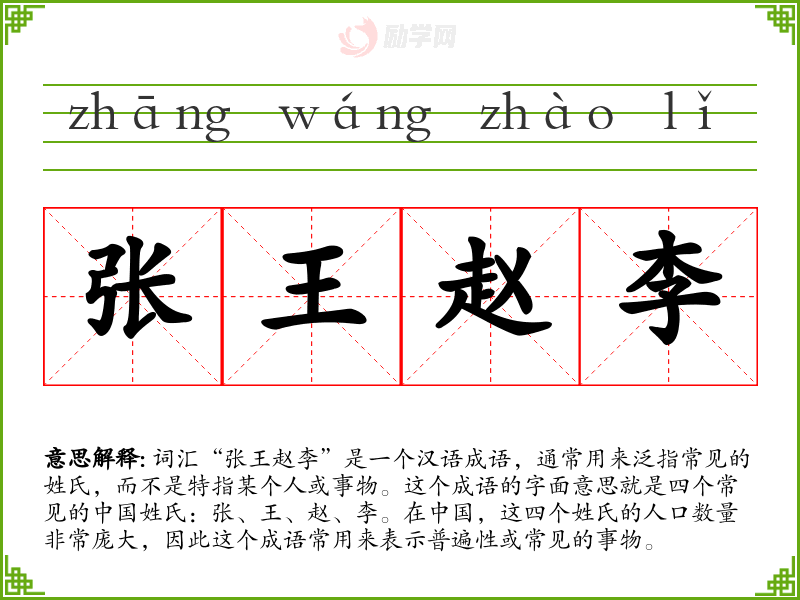 词汇“张王赵李”是一个汉语成语,通常用来泛指常见的姓氏,而不是特指某个人或事物。这个成语的字面意思就是四个常见的中国姓氏:张、王、赵、李。在中国,这四个姓氏的人口数量非常庞大,因此这个成语常用来表示普遍性或常见的事物。
