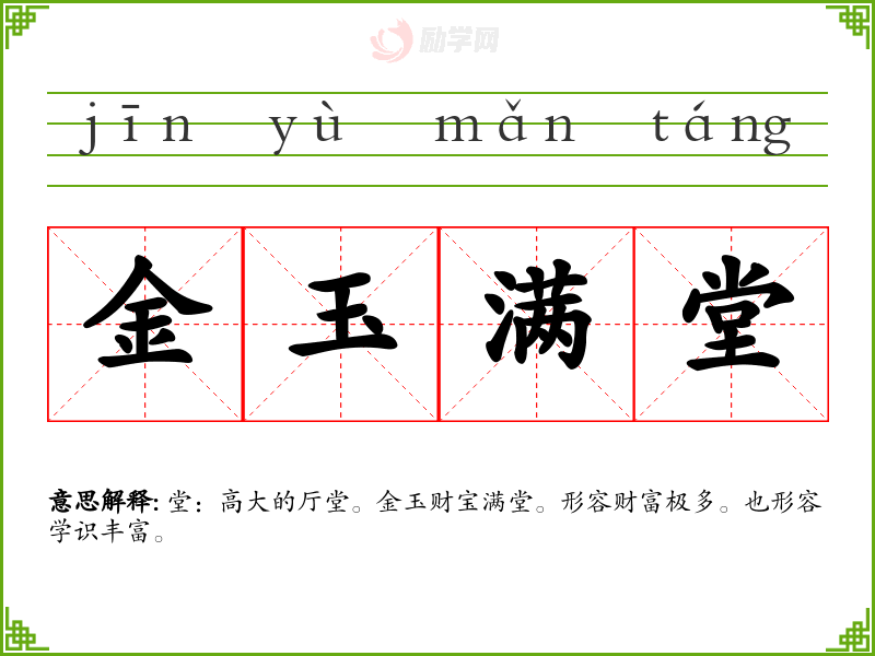 堂:高大的厅堂。金玉财宝满堂。形容财富极多。也形容学识丰富。