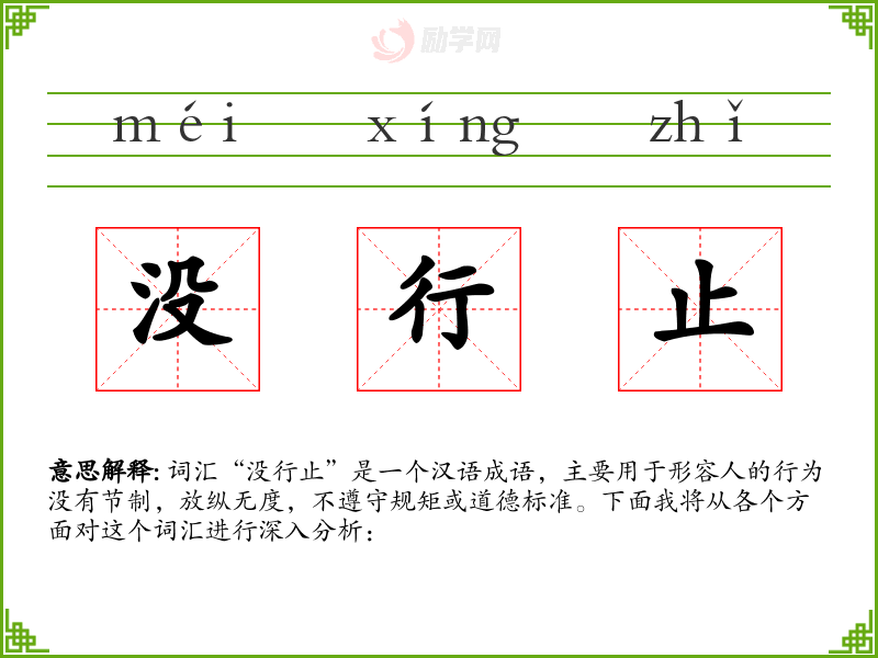 词汇“没行止”是一个汉语成语,主要用于形容人的行为没有节制,放纵无度,不遵守规矩或道德标准。下面我将从各个方面对这个词汇进行深入分析:
