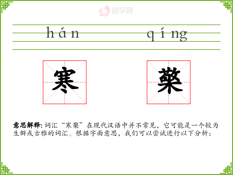 词汇“寒檠”在现代汉语中并不常见,它可能是一个较为生僻或古雅的词汇。根据字面意思,我们可以尝试进行以下分析: