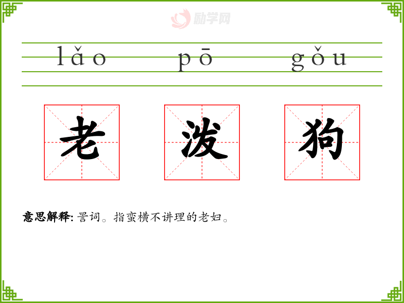 老泼狗的意思是:詈词。指蛮横不讲理的老妇。