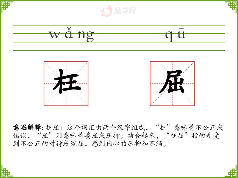 枉屈:这个词汇由两个汉字组成,“枉”意味着不公正或错误,“屈”则意味着委屈或压抑。结合起来,“枉屈”指的是受到不公正的对待或冤屈,感到内心的压抑和不满。