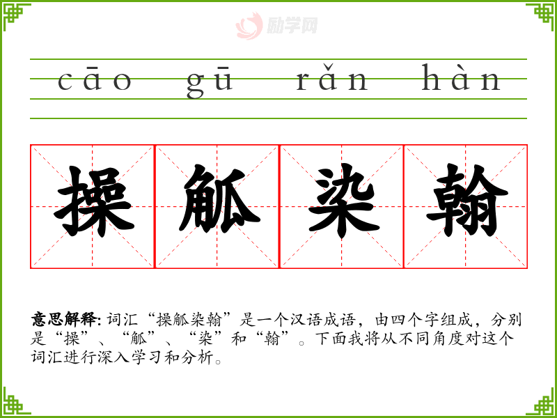 词汇“操觚染翰”是一个汉语成语,由四个字组成,分别是“操”、“觚”、“染”和“翰”。下面我将从不同角度对这个词汇进行深入学*和分析。