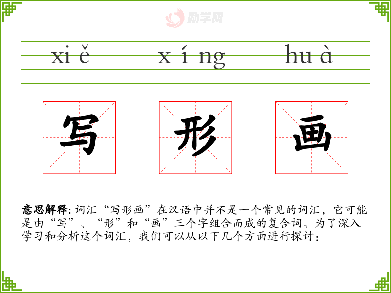 词汇“写形画”在汉语中并不是一个常见的词汇,它可能是由“写”、“形”和“画”三个字组合而成的复合词。为了深入学习和分析这个词汇,我们可以从以下几个方面进行探讨: