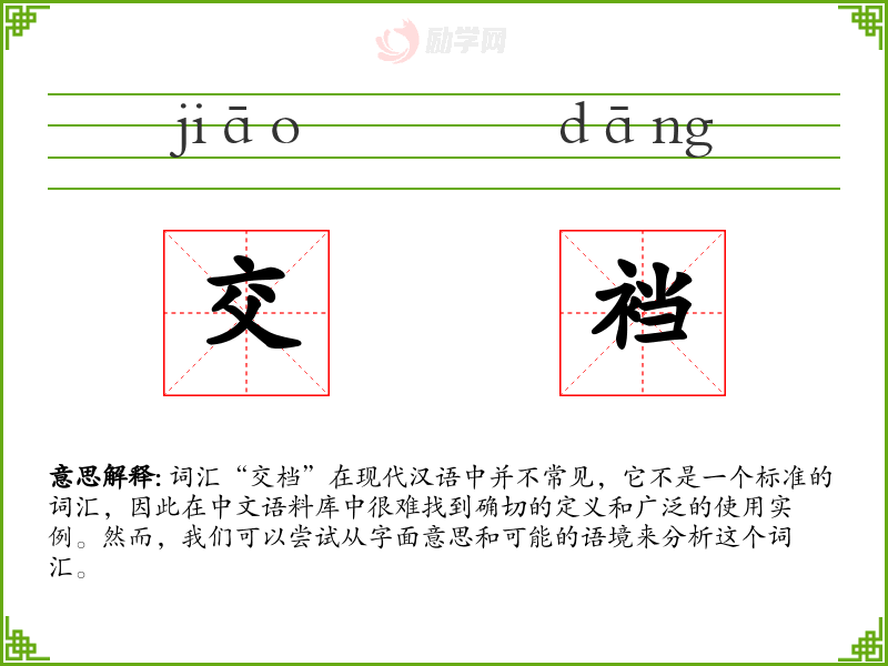 词汇“交档”在现代汉语中并不常见,它不是一个标准的词汇,因此在中文语料库中很难找到确切的定义和广泛的使用实例。然而,我们可以尝试从字面意思和可能的语境来分析这个词汇。