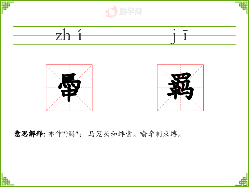羁[ jī ] 1. (会意。从网(罒),从革(皮革),从马。合起来表示用皮革制成的网络来把马络住。本义:马笼头)。 2. 同本义。 【引证】 韩愈《汴泗交流赠张仆射》-红牛缨绂黄金羁。 【组词】 羁縻、 羁勒 [更多解释]