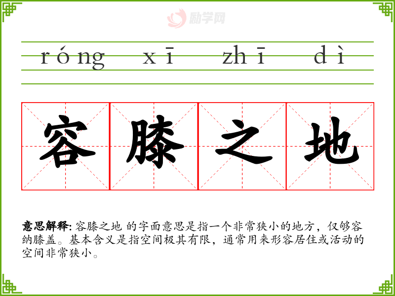 容膝之地 的字面意思是指一个非常狭小的地方,仅够容纳膝盖。基本含义是指空间极其有限,通常用来形容居住或活动的空间非常狭小。