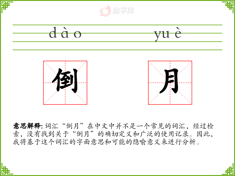 词汇“倒月”在中文中并不是一个常见的词汇,经过检索,没有找到关于“倒月”的确切定义和广泛的使用记录。因此,我将基于这个词汇的字面意思和可能的隐喻意义来进行分析。
