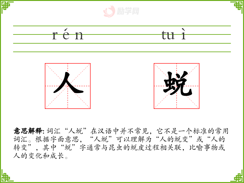 词汇“人蜕”在汉语中并不常见,它不是一个标准的常用词汇。根据字面意思,“人蜕”可以理解为“人的蜕变”或“人的转变”,其中“蜕”字通常与昆虫的蜕皮过程相关联,比喻事物或人的变化和成长。