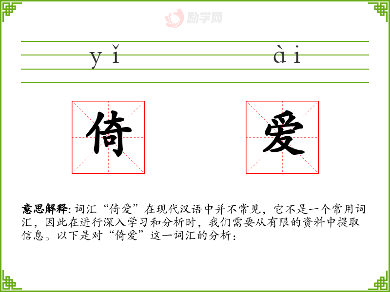 词汇“倚爱”在现代汉语中并不常见,它不是一个常用词汇,因此在进行深入学习和分析时,我们需要从有限的资料中提取信息。以下是对“倚爱”这一词汇的分析: