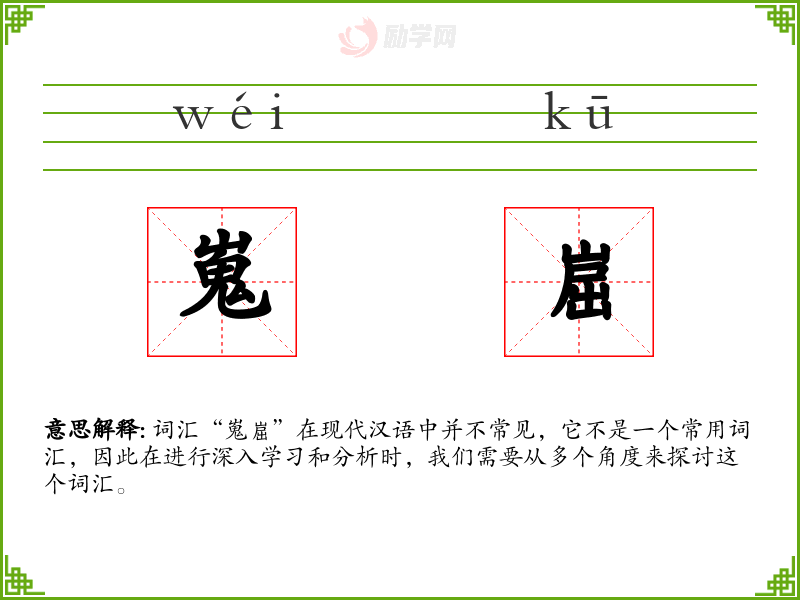 词汇“嵬崫”在现代汉语中并不常见,它不是一个常用词汇,因此在进行深入学*和分析时,我们需要从多个角度来探讨这个词汇。