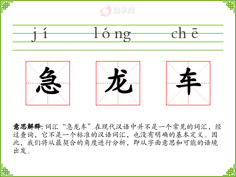 词汇“急龙车”在现代汉语中并不是一个常见的词汇,经过查询,它不是一个标准的汉语词汇,也没有明确的基本定义。因此,我们将从最契合的角度进行分析,即从字面意思和可能的语境出发。
