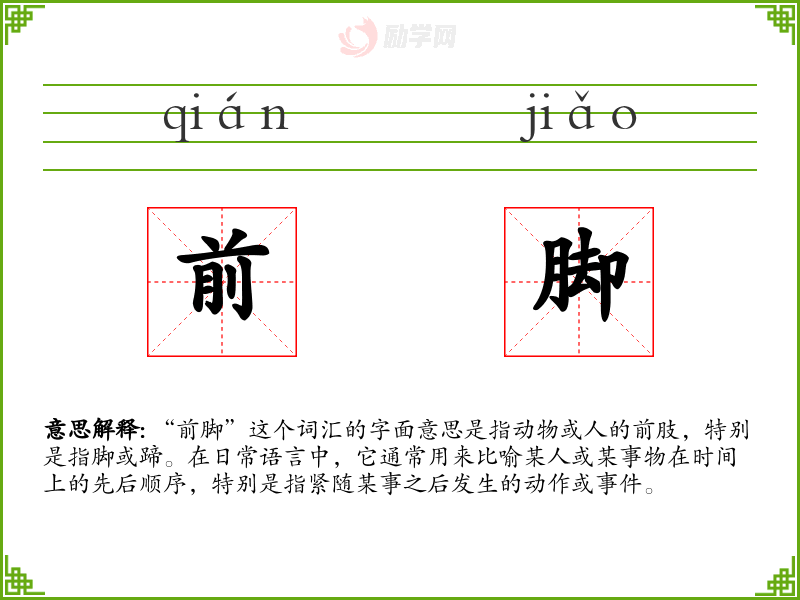 1.前脚的拼音是什么?前脚怎么读?
