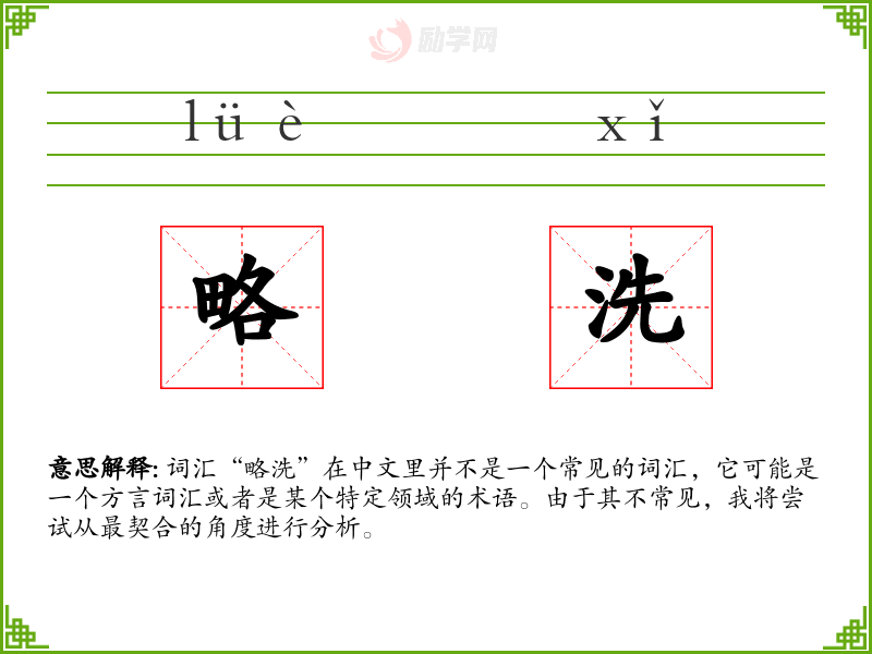 词汇“略洗”在中文里并不是一个常见的词汇,它可能是一个方言词汇或者是某个特定领域的术语。由于其不常见,我将尝试从最契合的角度进行分析。