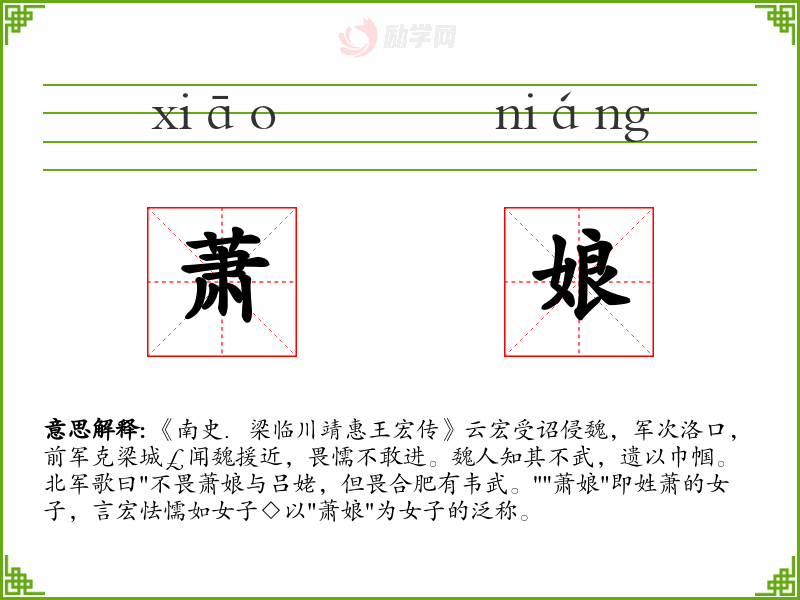 《南史.梁临川靖惠王宏传》云宏受诏侵魏,军次洛口,前军克梁城£闻魏援近,畏懦不敢进。魏人知其不武,遗以巾帼。北军歌曰"不畏萧娘与吕姥,但畏合肥有韦武。""萧娘"即姓萧的女子,言宏怯懦如女子◇以"萧娘"为女子的泛称。