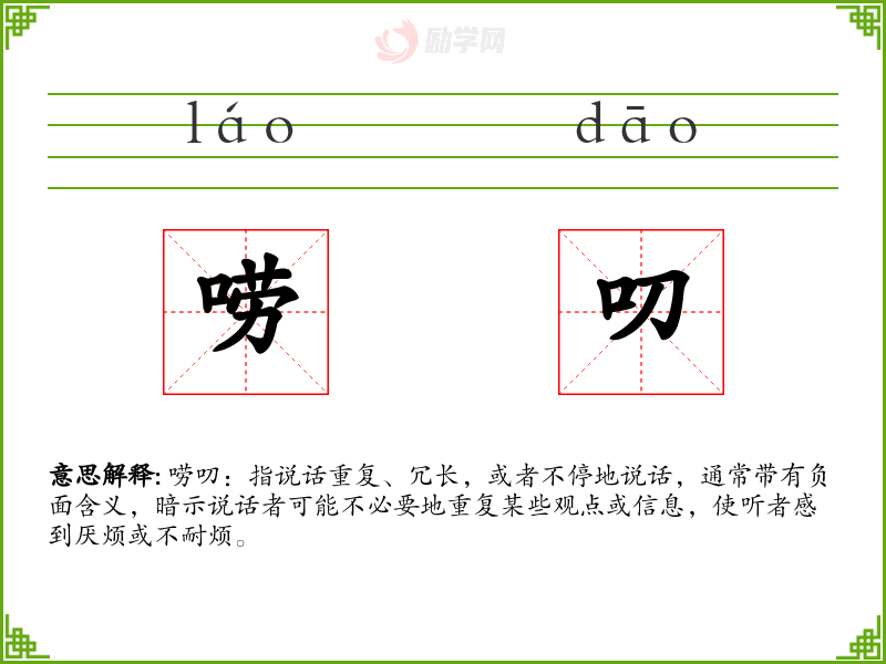唠叨:指说话重复、冗长,或者不停地说话,通常带有负面含义,暗示说话者可能不必要地重复某些观点或信息,使听者感到厌烦或不耐烦。