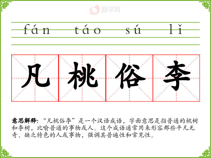 凡桃俗李的意思是:平凡、普通的桃花和李花。比喻庸俗的人或平常的事物。