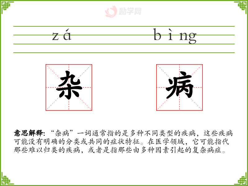 “杂病”一词由“杂”和“病”两个字组成。“杂”字意味着混合、不纯,而“病”字则指疾病。在古代汉语中,“杂病”可能更多指的是那些由多种因素引起的疾病,而在现代汉语中,它更多地被用来形容疾病的多样性和复杂性。