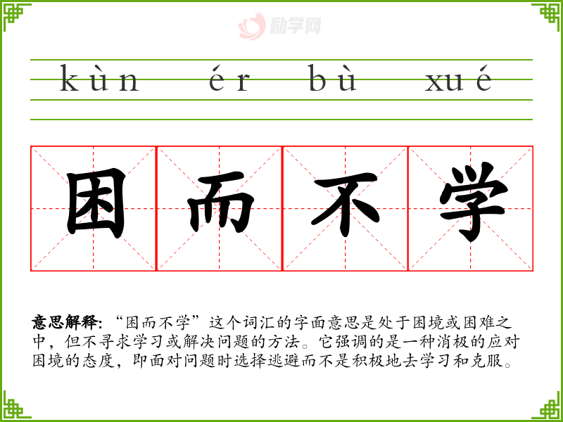 在文学作品中,“困而不学”可能被用来描述一个角色的性格特点,强调其懒惰或无助。在口语中,这个词汇可能被用来批评某人面对困难时的消极态度。在教育或心理学领域,这个词汇可能被用来讨论学*动机和应对策略。
