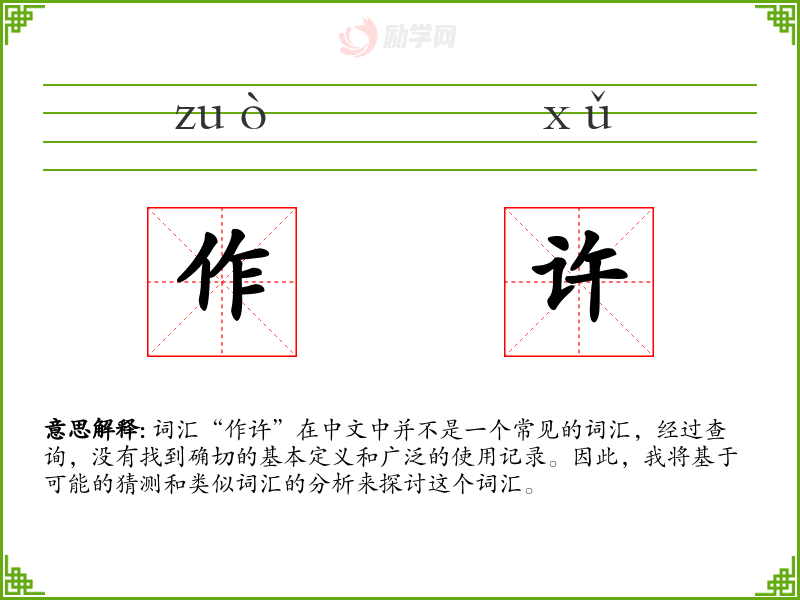 词汇“作许”在中文中并不是一个常见的词汇,经过查询,没有找到确切的基本定义和广泛的使用记录。因此,我将基于可能的猜测和类似词汇的分析来探讨这个词汇。