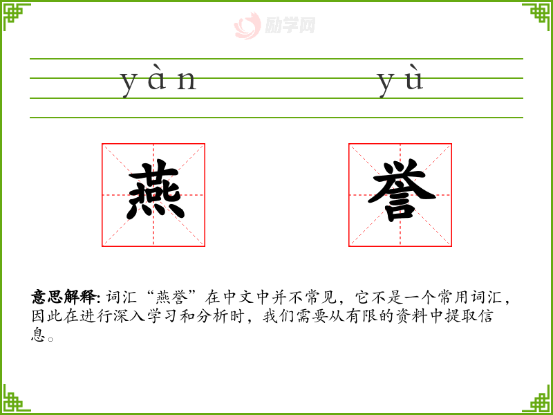 词汇“燕誉”在中文中并不常见,它不是一个常用词汇,因此在进行深入学*和分析时,我们需要从有限的资料中提取信息。