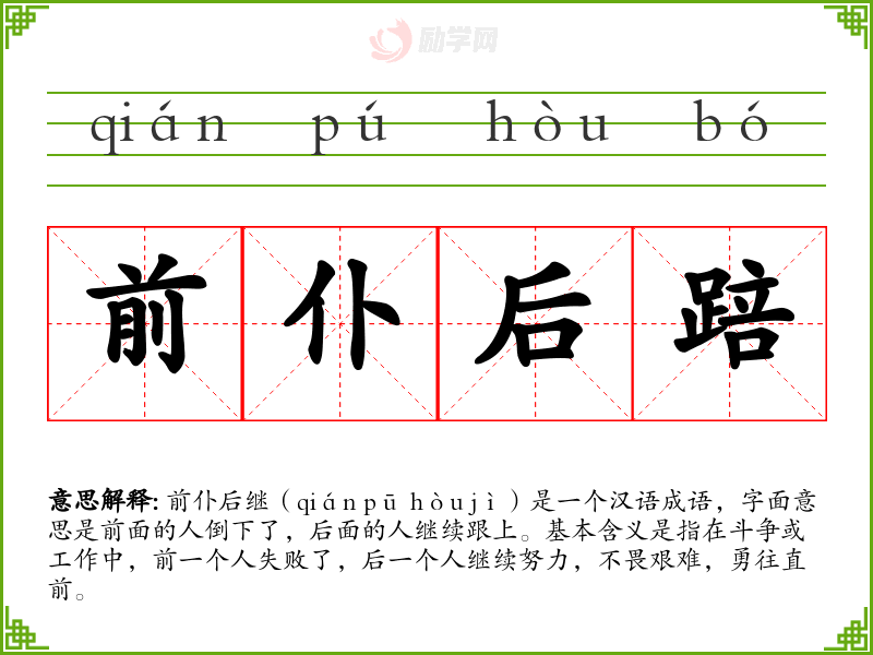 前仆后继(qián pū hòu jì)是一个汉语成语,字面意思是前面的人倒下了,后面的人继续跟上。基本含义是指在斗争或工作中,前一个人失败了,后一个人继续努力,不畏艰难,勇往直前。