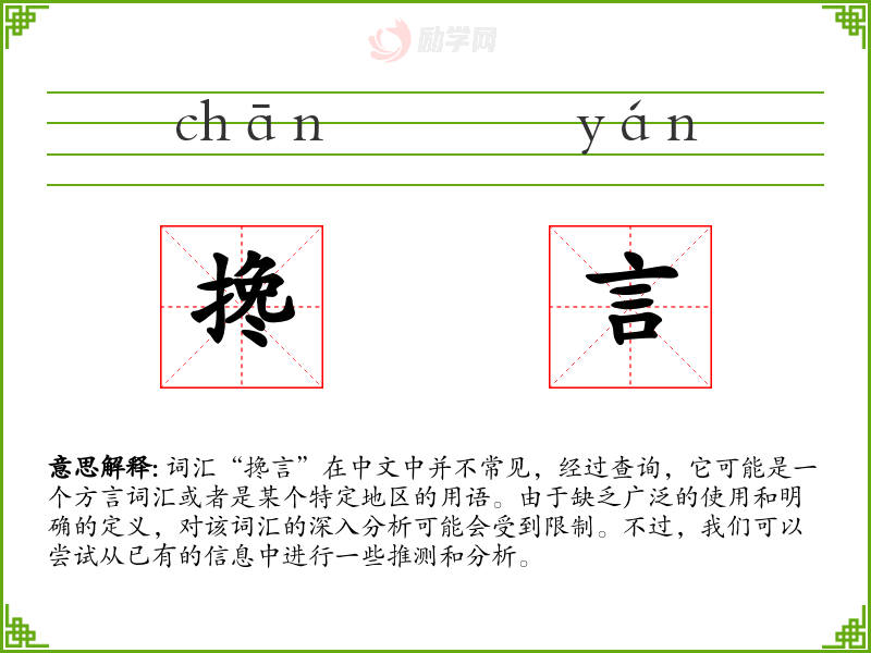 词汇“搀言”在中文中并不常见,经过查询,它可能是一个方言词汇或者是某个特定地区的用语。由于缺乏广泛的使用和明确的定义,对该词汇的深入分析可能会受到限制。不过,我们可以尝试从已有的信息中进行一些推测和分析。