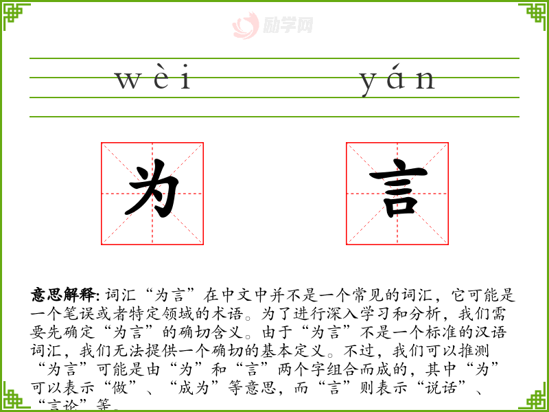 词汇“为言”在中文中并不是一个常见的词汇,它可能是一个笔误或者特定领域的术语。为了进行深入学习和分析,我们需要先确定“为言”的确切含义。由于“为言”不是一个标准的汉语词汇,我们无法提供一个确切的基本定义。不过,我们可以推测“为言”可能是由“为”和“言”两个字组合而成的,其中“为”可以表示“做”、“成为”等意思,而“言”则表示“说话”、“言论”等。