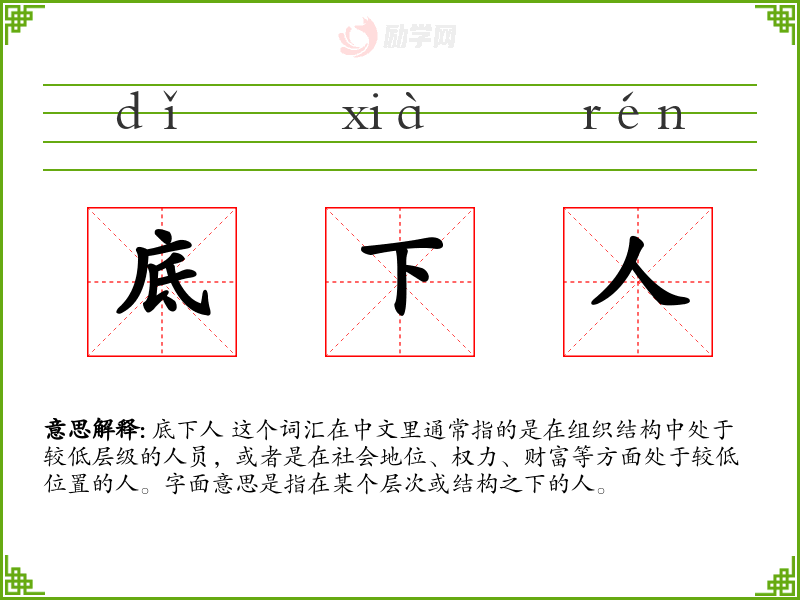底下人的拼音是:dǐ xià rén