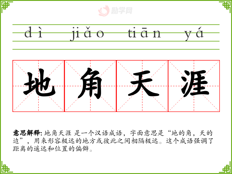 地角天涯 是一个汉语成语,字面意思是“地的角,天的边”,用来形容极远的地方或彼此之间相隔极远。这个成语强调了距离的遥远和位置的偏僻。