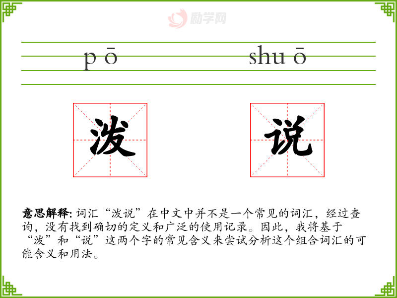 词汇“泼说”在中文中并不是一个常见的词汇,经过查询,没有找到确切的定义和广泛的使用记录。因此,我将基于“泼”和“说”这两个字的常见含义来尝试分析这个组合词汇的可能含义和用法。
