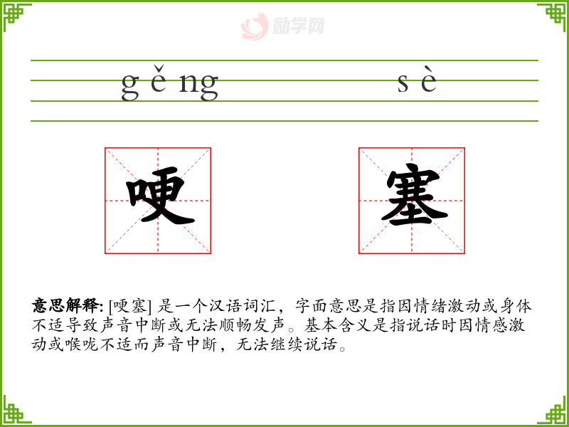 哽塞的意思是:哽 2.她才说了两个字,话便~在嗓子眼儿里了。