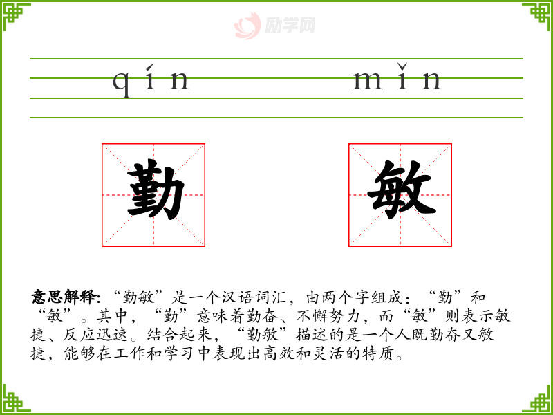 想象一个清晨的图书馆,勤奋的学生在书架间快速移动,翻阅书籍的声音和笔尖在纸上滑动的沙沙声,这些都是“勤敏”带来的视觉和听觉联想。