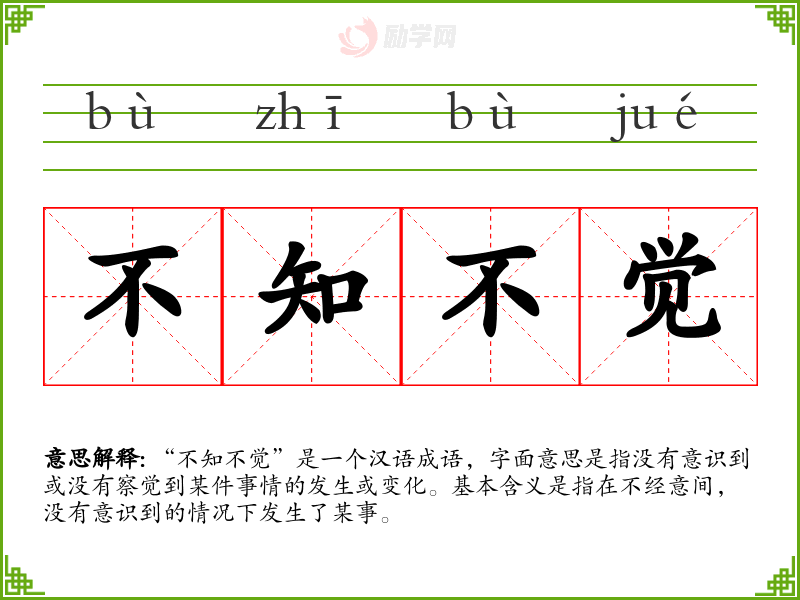 “不知不觉”是一个汉语成语,字面意思是指没有意识到或没有察觉到某件事情的发生或变化。基本含义是指在不经意间,没有意识到的情况下发生了某事。