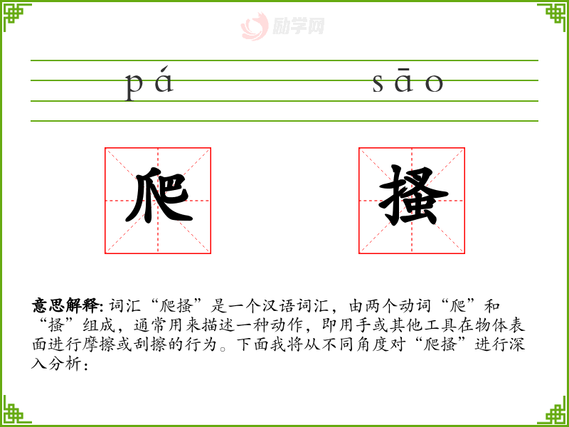 词汇“爬搔”是一个汉语词汇,由两个动词“爬”和“搔”组成,通常用来描述一种动作,即用手或其他工具在物体表面进行摩擦或刮擦的行为。下面我将从不同角度对“爬搔”进行深入分析: